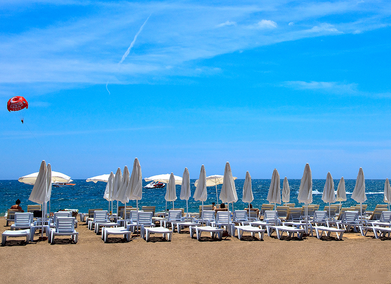 Breiter, langer Sandstrand. Sonnenschirme und Liegen werden kostenlos zur Verfügung gestellt.